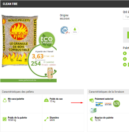 Les différents moyens de paiement acceptés par le fournisseur sont mentionnés dans le fiche technique du produit. Selon les pellets choisis, le paiement se fait soit à la livraison en espèce, en écochèques ou par carte Bancontact, soit par virement anticipé.