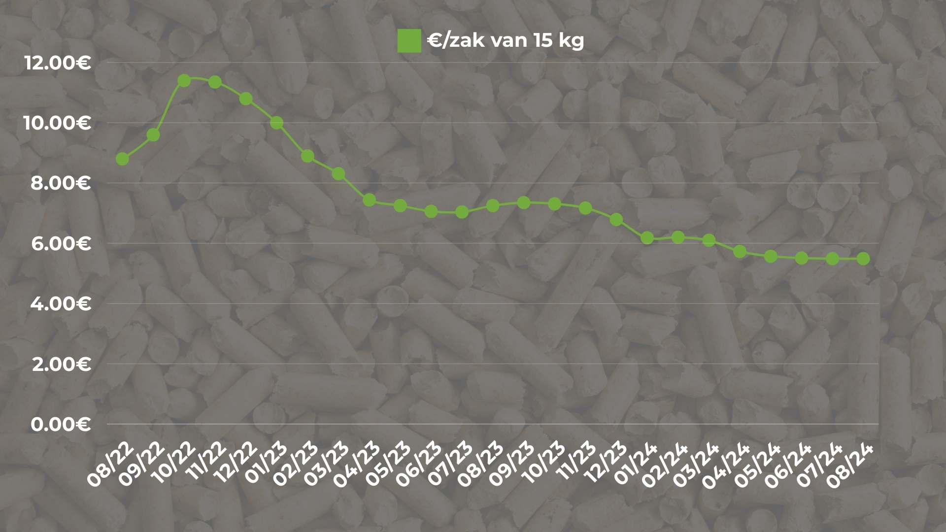 Sommige leveranciers hebben al prijsverhogingen toegepast, maar er zijn nog steeds mooie opportuniteiten. Wacht niet te lang om een voorraad pellets aan te leggen tegen de beste prijs van het jaar. De gemiddelde prijs van pellets is volgens Valbiom sinds oktober 2023 gestaag gedaald, van € 7,31 naar € 5,49 per zak.